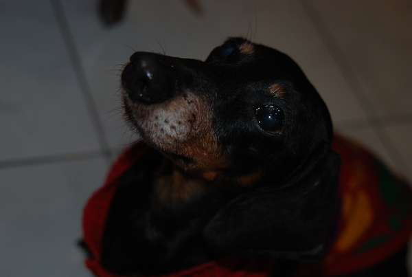 用餐後來到我家,梅子媽媽先抱牠洗乾淨腳爪之後,才放他落地,到了新鮮地方,YOYO興奮的東聞西瞧,幾個房間裡晃來繞去的,模樣煞是可愛。但臘腸狗終是臘腸狗,食物才是他們最好的朋友,為了換得YOYO專注可愛的神情,我拿出削好的蘋果巴結他,剛回家的光先生拿出相機等在一旁,努力搶拍之下才抓住YOYO迷人的神韻。