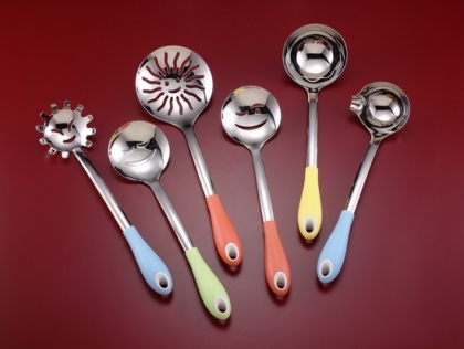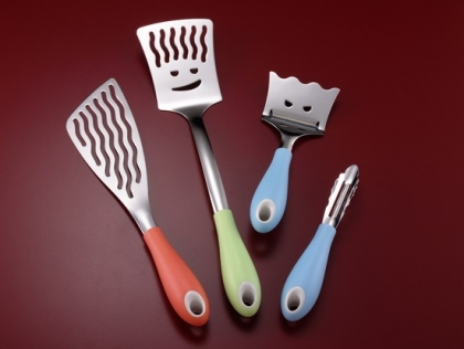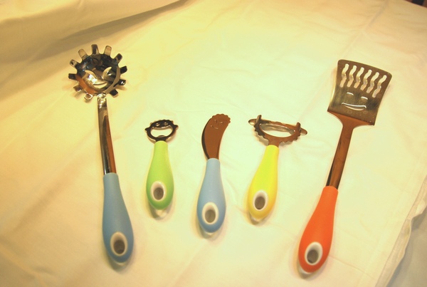 我在一個不起眼的小五金行裡發現了這組廚具,當下就興奮的不忍離手,驚訝於歐洲的設計師怎麼可以如此有創意,把簡單且尋常不過的各式廚房小物,變成有生命一般的鮮活,每一個小用品都有了一個屬於自己的表情。而且不鏽鋼的材質看來很耐用,圓潤又擁有繽紛色彩的把手不但握在手裡操作方便,掛成一排,應該也是頗為特殊又富童趣的廚房風景。