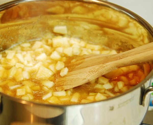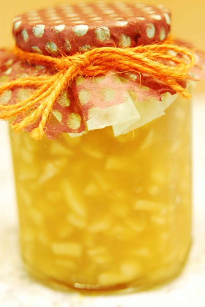 做果醬前,得先把盛裝的玻璃瓶煮沸,倒扣風乾,乾淨的瓶子是果醬能保持較久的關鍵。然後把蘋果一半切丁一半打成泥,和其他所有的材料一起放入不鏽鋼鍋裡熬煮,邊煮邊攪拌,煮滾之後轉較小的火,開始用篩網撈浮起的泡沫雜質,一直到果醬呈現光滑狀(這是我覺得最難的一個步驟了),便可熄火裝瓶。