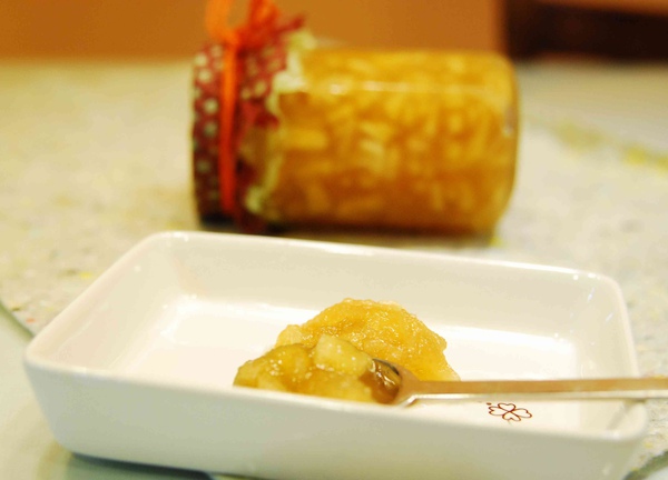 這次的蘋果醬,用的是香香脆脆的富士蘋果、來自屏東的有機檸檬、細砂糖和天然龍眼蜜。蘋果和砂糖的比例大約是1:0.6,比我在書上看到的略低,原因是我偏好比較自然帶酸味的果醬,所以習慣減糖,但是可能會讓保存的時間縮短,所以也必須盡快用完(我試過,兩個禮拜是OK的)。蜂蜜和檸檬則是酌量,這次大約五百克的蘋果,我用了50c.c.的蜂蜜和一顆檸檬。