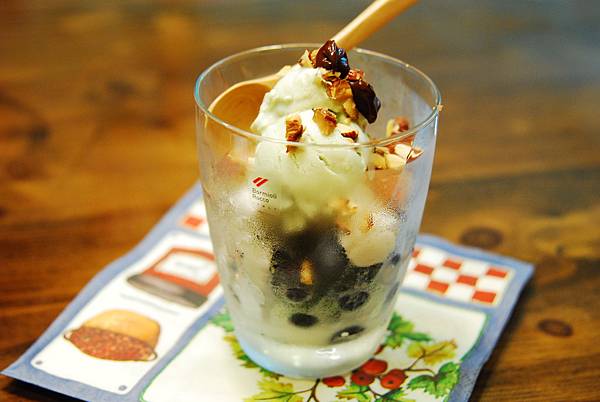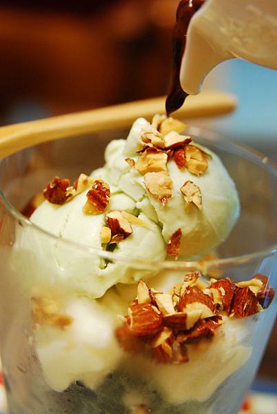 為了不負所托,認真的想了一下,拿個清澈的玻璃杯,放點藍莓,然後舀上兩種口味的冰淇淋,豪邁的灑上碎杏仁,淋上苦甜巧克力,就有點點餐廳裡冰淇淋聖代的味道了…..