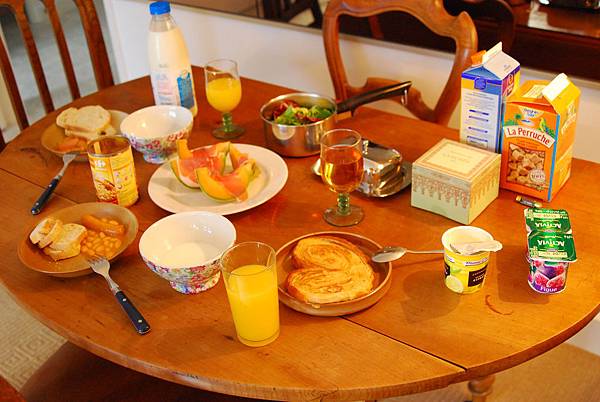 離開了巴黎,還是盡量找有附小廚房的旅館),每天早上依然認真地張羅我們的早餐。
