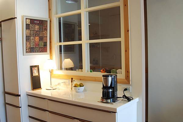 先來說玄關吧,這裡有我很愛的白色格子窗,還用窗下的空間做了一個餐廳的備餐櫃,自己覺得空間利用的很好,也還滿有味道的。