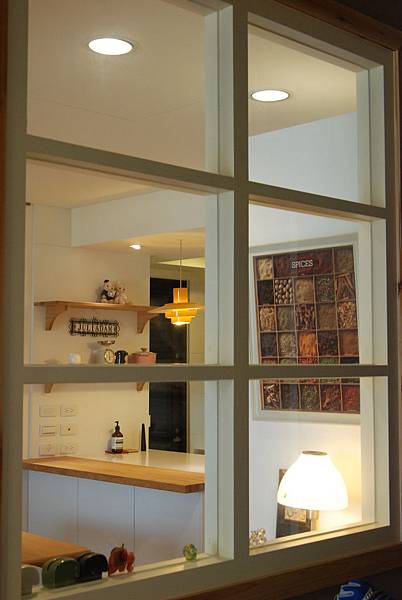 透過這扇窗看室內,看開放式餐廳,光線柔和了,畫面變的更有故事性,進來的人會想,這窗後,一定是每天都有溫暖的燈光,有著熱騰騰飯菜和咖啡香的餐廳吧!