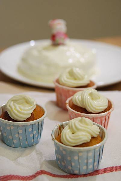 發現這個紅蘿蔔蛋糕食譜時,心中也是有點小小疑惑:這樣會好吃嗎?但試過之後疑慮全消, 光先生還豎起大拇指連聲說讚,一邊一口接一口的停不下來。把紅蘿蔔磨泥做成蛋糕,那種青澀的土味都不見了,入口是甘甜的香氣,然後用的是蔬菜油,熱量不會太高,很適合當成健康的下午茶點心。外邊的白色乳霜,是高鈣的奶油乳酪加上冬季盛產的橙汁和充滿香氣的橙皮,打發的柔柔滑滑,裝飾成漂亮的杯子蛋糕卻又酸酸甜甜,清爽不膩口。