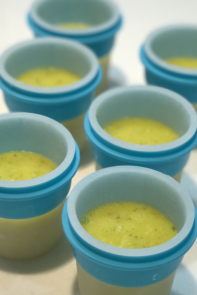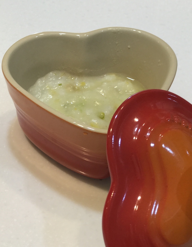 蛋捲滿六個月之後,我開始會認真準備粥品,讓他帶到保母家,在上午的時候食用(兩餐奶中間),我用比較偷懶的方法,每周只做一次,用鑄鐵鍋熬一鍋粥,裡面會加兩至三樣他已經吃過,沒有過敏反應的食物,用攪拌棒打成泥後,以矽膠杯分裝好冷凍,一天解凍一杯帶便當。然後再準備兩至三樣新食物的食物泥,做成一塊塊小冰磚。在一周間搭配著放入粥底中混和,這樣小蛋捲就不會天天吃一模一樣的粥而生膩,也能夠繼續累積嘗試新的食物。