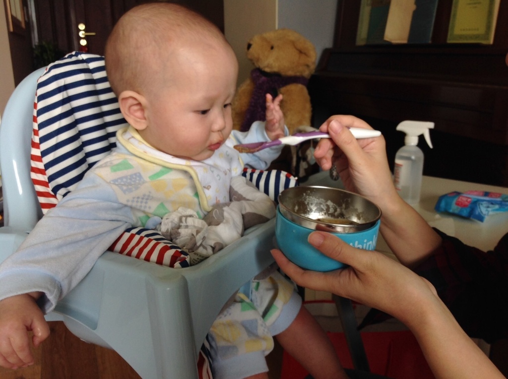 四到六個月時期,副食品只是培養嬰兒對食物的耐受度和探索,分量不是重點,重點是少量多樣的嘗試。所以我大概兩三天準備一種食物泥,讓蛋捲吃吃玩玩,每天從保母家回來,我就餵他吃一點,兩個月下來,他也試吃了十幾種食物,包括十倍粥、青花菜、紅蘿蔔、地瓜、馬鈴薯、青江菜、小松菜等等。