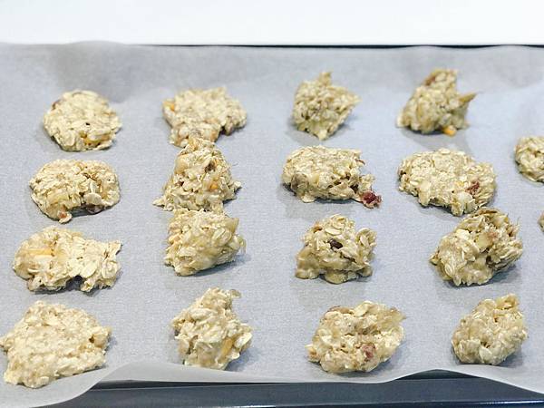 3.把香蕉燕麥泥均勻地擠在烤盤紙上